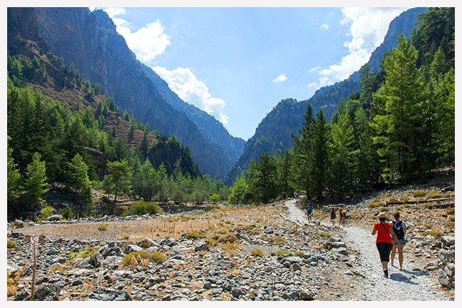 Туристический маршрут протяженностью 16 км проходит по каменистым лесным тропам, лестницам, валунам, под лучами южного солнца, и требует от путешественников хорошей физической формы. Он начинается на юго-западе острова, в центре горного массива Лефка-Ори, и спускается почти к самому берегу Ливийского моря, перепад высот при этом составляет 1300 метров.